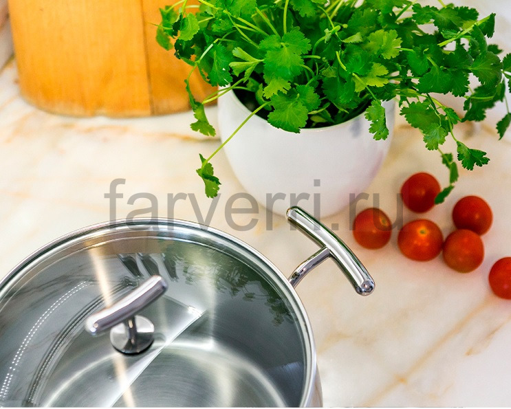 Крышка из жаропрочного стекла плотно прилегает к краям кастрюли и удерживает тепло.