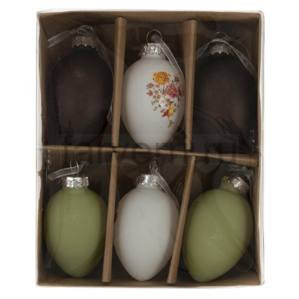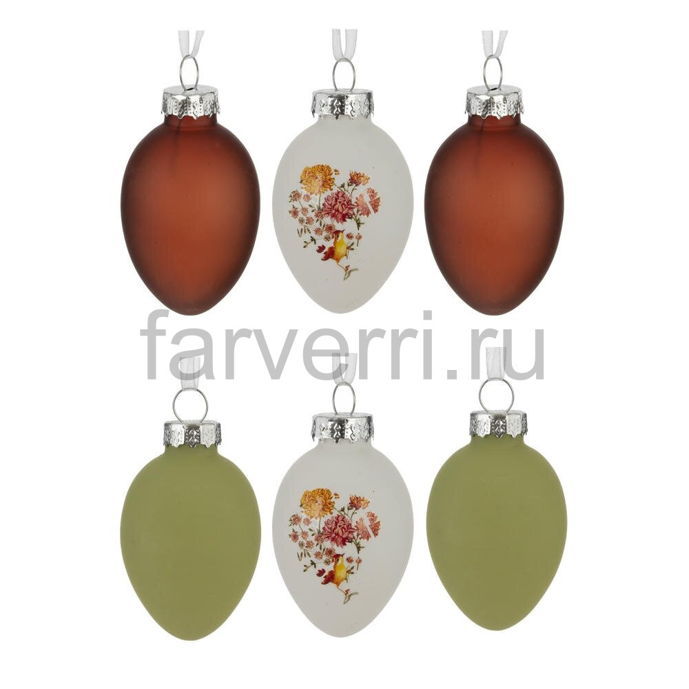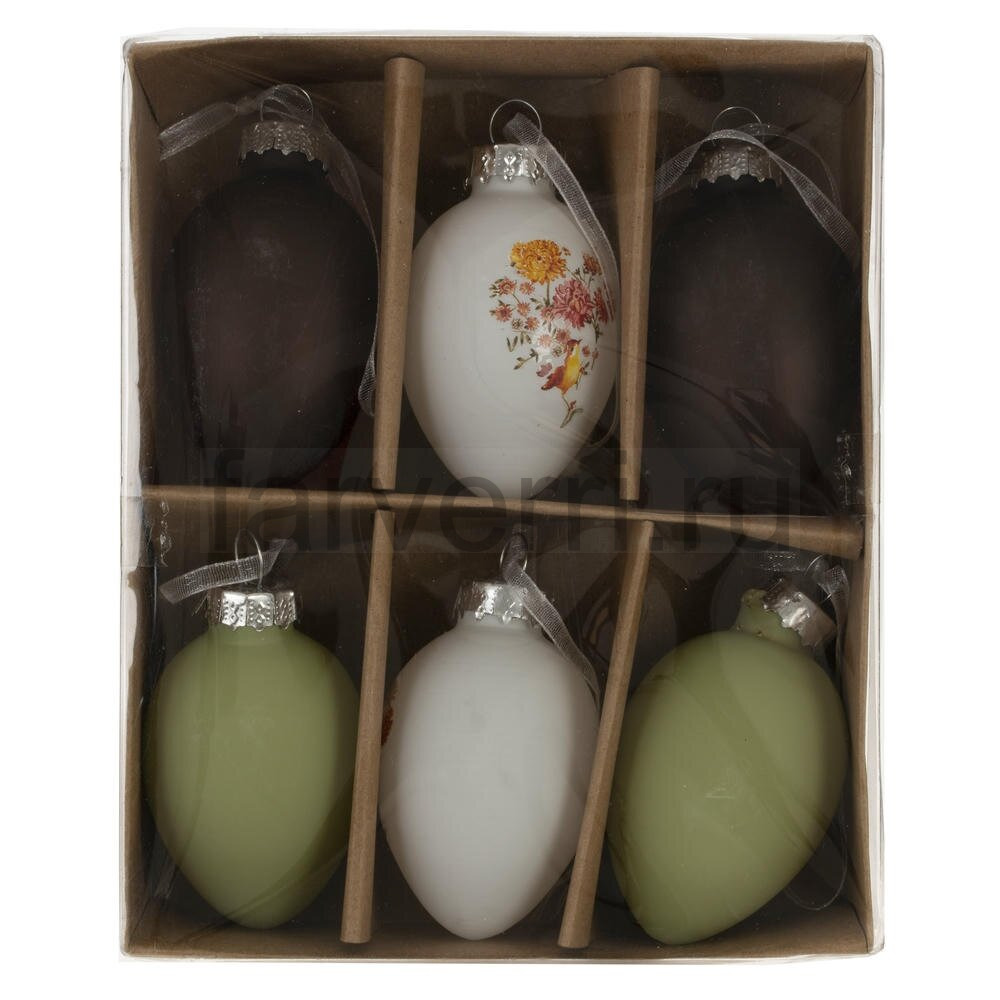 Набор из 6-ти декоративных подвесных украшений «Яйцо пасхальное» станет изысканным акцентом весеннего декора. В комплект входят стеклянные яйца в матовых оттенках тёплого коричневого и нежного зелёного, а также два светлых яйца с изящным цветочным рисунком.