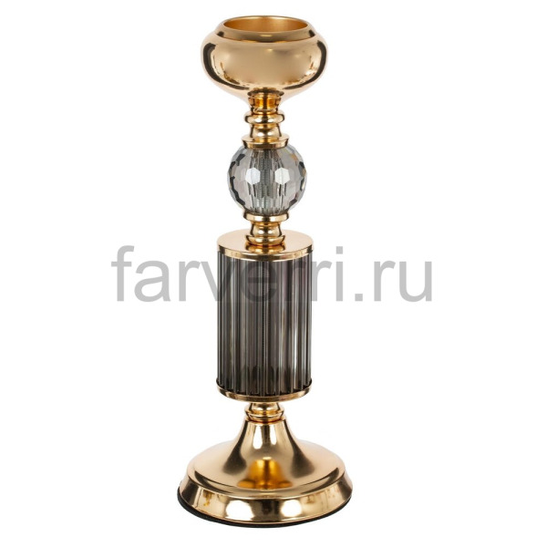 Элегантный подсвечник из сочетания стекла и металла станет изысканным акцентом в интерьере гостиной, спальни или праздничного стола. Основание и верхняя чаша выполнены из металла с глянцевым золотистым покрытием, которое красиво отражает свет и подчеркивает благородный стиль изделия. Центральная часть украшена рифлёной стеклянной колонной глубокого дымчатого оттенка и гранёным прозрачным шаром, создающим игру бликов при зажжённой свече. Подсвечник устойчив, подходит для классических и декоративных свечей, гармонично дополняет как современный, так и классический декор, придавая пространству атмосферу уюта и роскоши. Для свечи, диаметром 5 см.