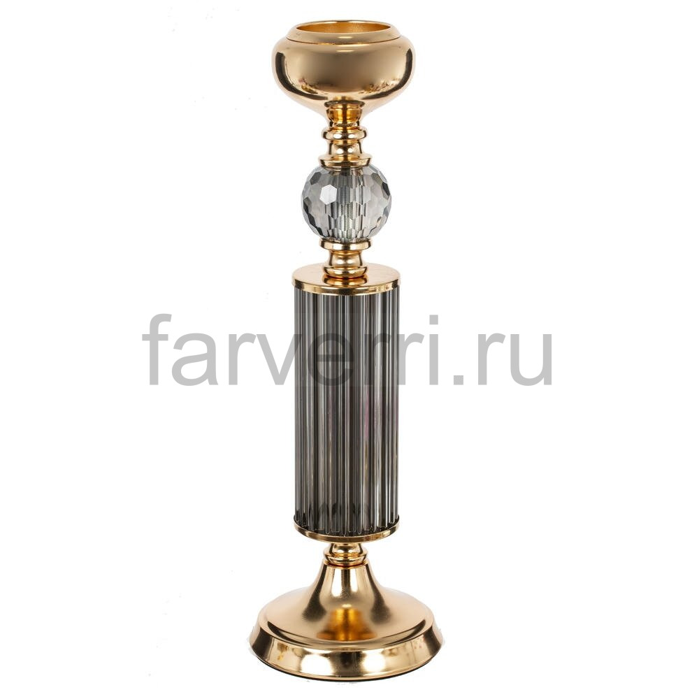 Элегантный подсвечник из сочетания стекла и металла станет изысканным акцентом в интерьере гостиной, спальни или праздничного стола. Основание и верхняя чаша выполнены из металла с глянцевым золотистым покрытием, которое красиво отражает свет и подчеркивает благородный стиль изделия. Центральная часть украшена рифлёной стеклянной колонной глубокого дымчатого оттенка и гранёным прозрачным шаром, создающим игру бликов при зажжённой свече. Подсвечник устойчив, подходит для классических и декоративных свечей, гармонично дополняет как современный, так и классический декор, придавая пространству атмосферу уюта и роскоши. Для свечи, диаметром 5 см.