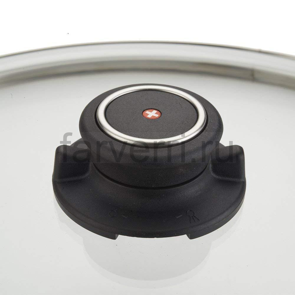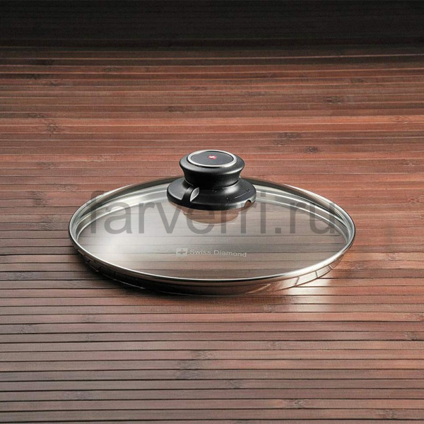 Крышка Swiss Diamond выполнена из высококачественного термостойкого стекла и имеет металлический ободок. На крышке имеется термостойкая ручка, что позволяет использовать ее для готовки в духовке при температуре до 260 градусов, так же предусмотрена вентиляция, что позволяет пару выходить не повышая при этом давление внутри посуды, в которой готовится пища.