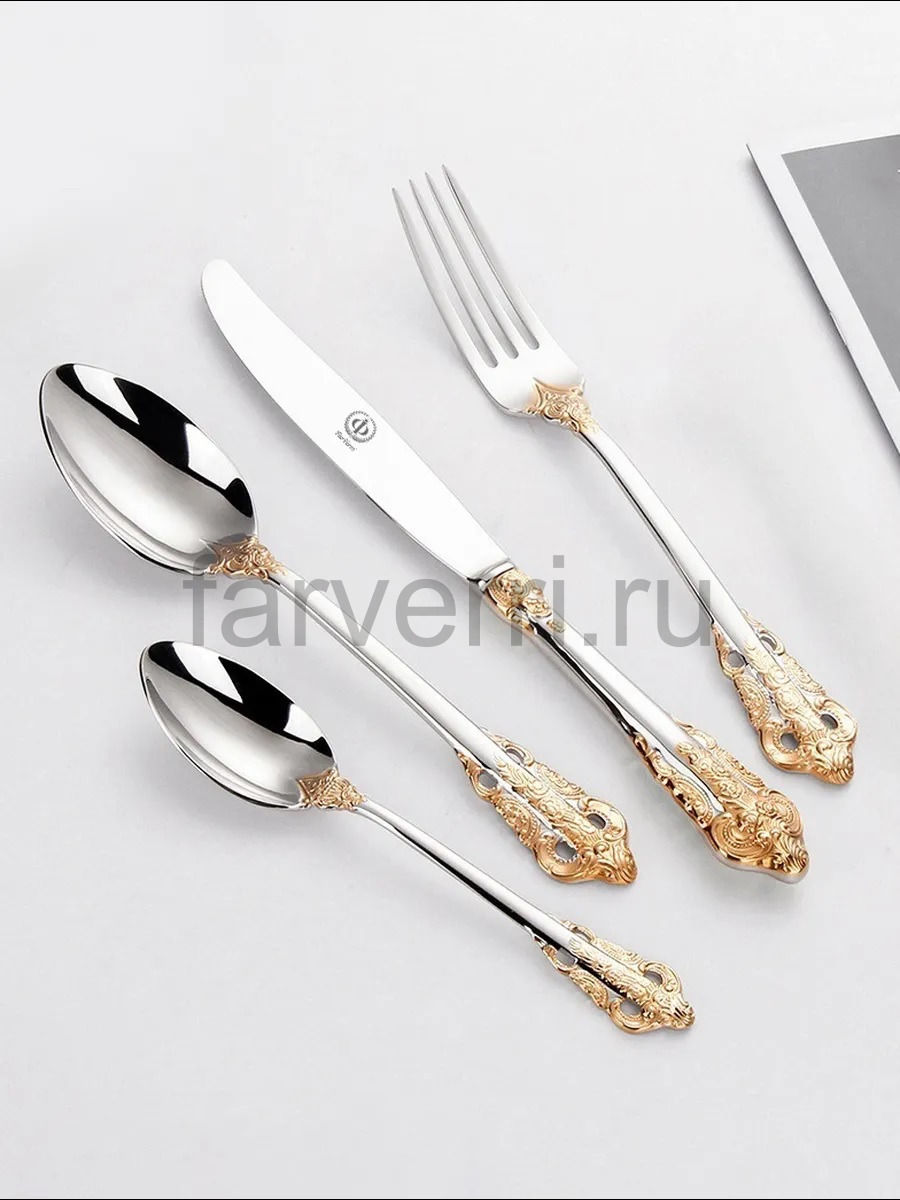 Столовые приборы FarVerri изготовлены из высококачественной стали 18/10 марки SUS304. На ручках покрытие 24-каратным золотом.