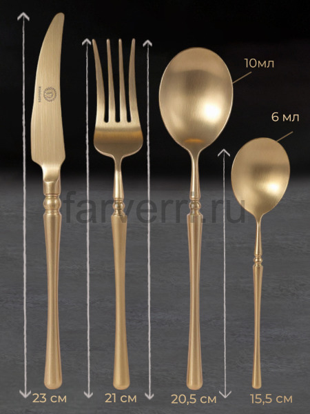 Набор столовых приборов FarVerri - это элегантный и статусный акцент Вашей сервировки, способный моментально внести торжественную нотку в застолье, а также отличный подарок значимым Вам людям.