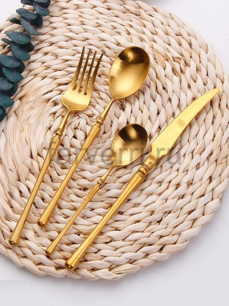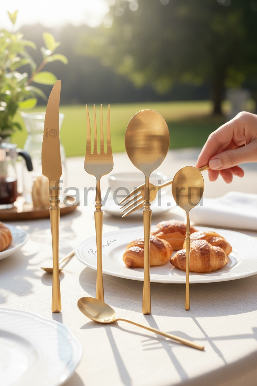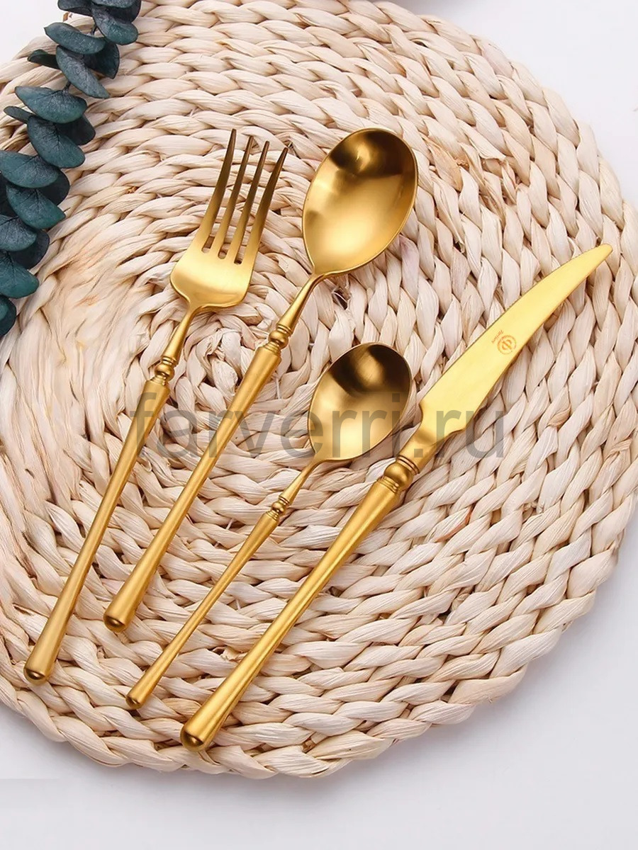 Чтобы изделия сохранили первоначальный роскошный вид, предпочтителен ручной уход. Не применяйте средства с абразивными частицами и грубые губки. После использования приборов сразу их ополосните и протрите насухо мягким полотенцем. Cтоловые приборы из нержавеющей стали с золотым покрытием можно мыть посудомоечной машине в режиме до 50 градусов, с применением жидкого моющего средства.