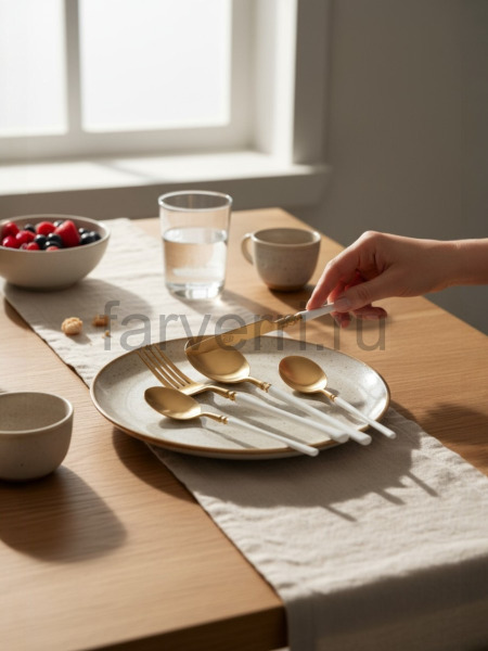 Чтобы изделия сохранили первоначальный роскошный вид, предпочтителен ручной уход. Не применяйте средства с абразивными частицами и грубые губки. После использования приборов сразу их ополосните и протрите насухо мягким полотенцем. Cтоловые приборы из нержавеющей стали с золотым покрытием можно мыть посудомоечной машине в режиме до 50 градусов, с применением жидкого моющего средства.