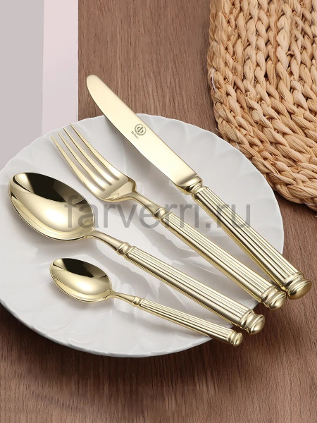 Чтобы изделия сохранили первоначальный роскошный вид, предпочтителен ручной уход. Не применяйте средства с абразивными частицами и грубые губки. После использования приборов сразу их ополосните и протрите насухо мягким полотенцем. Cтоловые приборы из нержавеющей стали с PVD покрытием можно мыть посудомоечной машине в режиме до 50 градусов, с применением жидкого моющего средства.