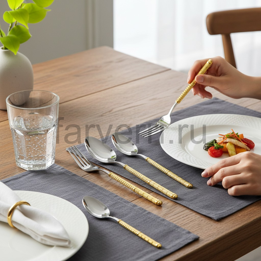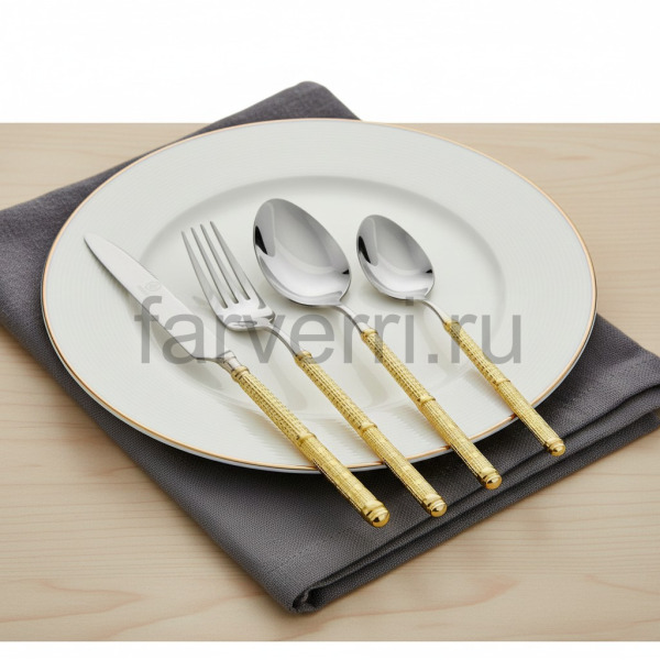Столовые приборы FarVerri изготовлены из высококачественной стали 18/10 марки SUS304. Ручки столовых приборов сверху покрыты 24-каратным золотом.