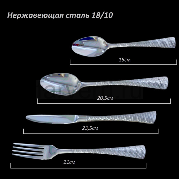 Состав | 6 столовых ложек, 6 вилок, 6 ножей, 6 чайных ложек |